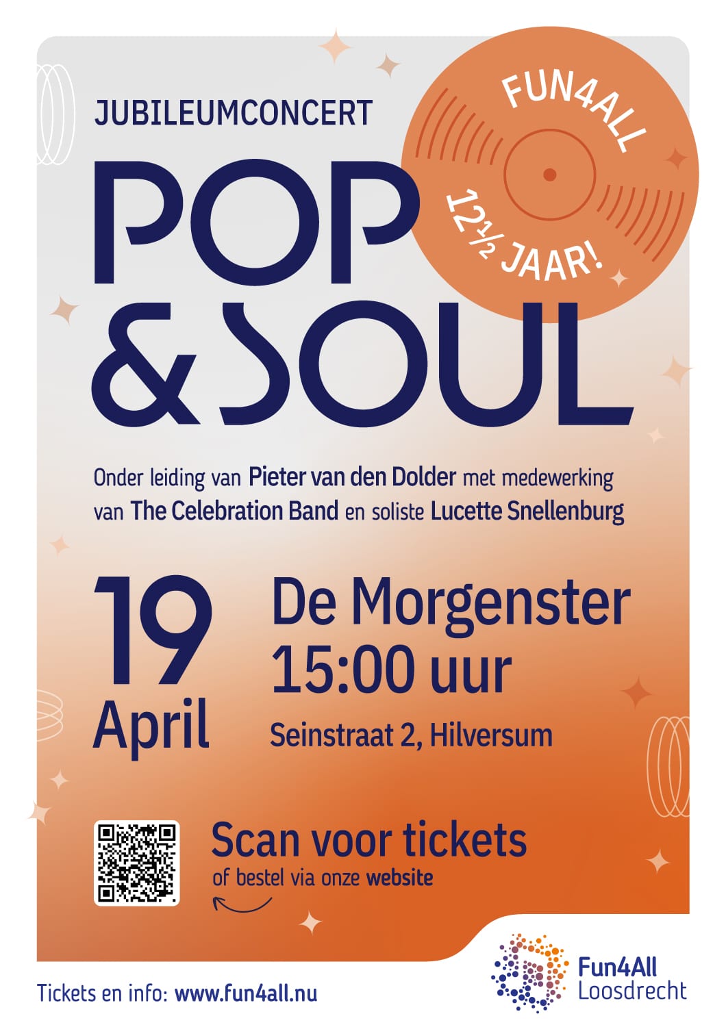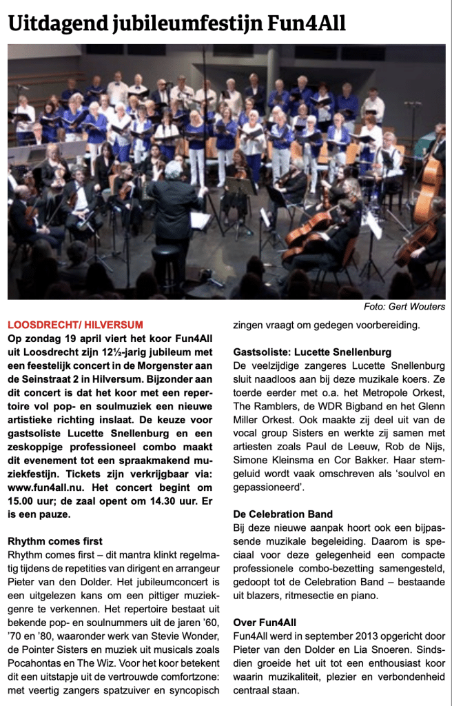 Op zondag 19 april 2026 viert het koor Fun4All uit Loosdrecht haar 12½ -jarig jubileum met een concert in de Morgenster, Seinstraat 2 in Hilversum.